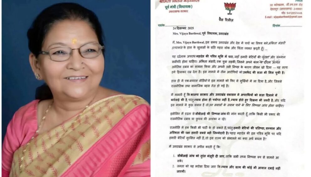 वरिष्ठ भाजपा नेत्री व पूर्व विधायक विजया बर्थवाल ने अंकिता हत्याकांड की सीबीआई जांच की मांग की है। गौरतलब है कि श्रीमती बर्थवाल यमकेश्वर विस् क्षेत्र से 3 बार विधायक रह चुकी हैं। श्रीमती बर्थवाल की गिनती भाजपा के वरिष्ठ व बेदाग छवि की नेत्री के रूप में होती है। उनकी इस मांग के बाद भाजपा के अंदर लगातार बन रही उहापोह की स्थिति और गंभीर होती जा रही है।