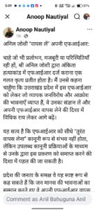 अपनी फेसबुक पोस्ट के जरिये अनूप नौटियाल ने ये सलाह दी है। अनूप नौटियाल ने लिखा है कि, चाहे जो भी प्रलोभन, मजबूरी या परिस्थितियाँ रही हों, अनिल जोशी द्वारा अंकिता हत्याकांड में एफआईआर दर्ज कराना एक गलत कृत्य प्रतीत होता है। उन्होंने लिखा कि मैं उनसे कहना चाहूँगा कि उत्तराखंड प्रदेश में इस एफआईआर को लेकर जो व्यापक जनविरोध और आक्रोश की भावनाएँ व्याप्त हैं, वे उनका संज्ञान लें और अपनी एफआईआर वापस लेने की दिशा में विधिक राय लेकर आगे बढ़ें। अपनी पोस्ट में उन्होंने आगे लिखा है कि,