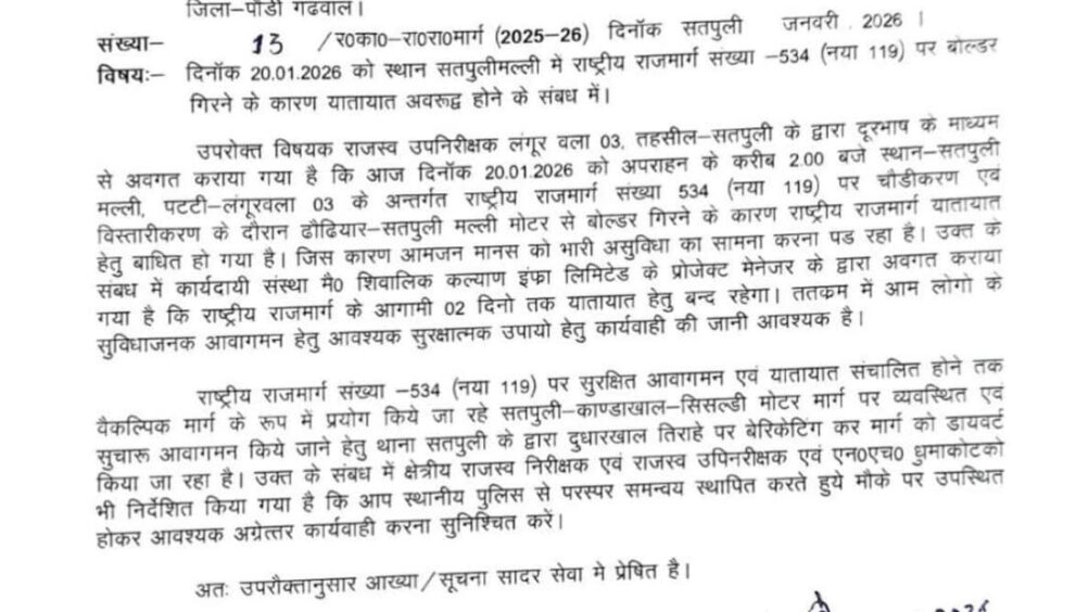 पौड़ी-कोटद्वार नेशनल हाइवे आगामी दो दिनों के लिए पूरी तरह बंद