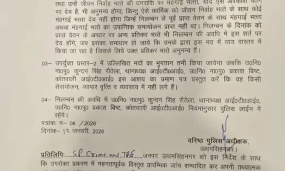 वहीं, चौकी पैगा, कोतवाली आईटीआई पर तैनात कुल 10 अधिकारी एवं कर्मचारियों को तत्काल प्रभाव से लाइन हाजिर कर दिया गया है। सभी को पुलिस लाइन्स, रुद्रपुर में तत्काल आमद करने के निर्देश दिए गए हैं।