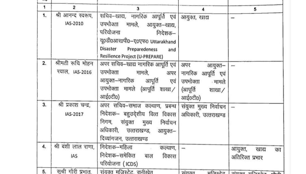 शासन द्वारा आज 6 आईएएस अधिकारियों के तबादले कर दिए गए हैं। पौड़ी की जॉइंट मजिस्ट्रेट दीक्षिता जोशी को इसी पद पर रानीखेत भेज दिया गया है जबकि रानीखेत की संयुक्त मजिस्ट्रेट गौरी प्रभात उनका स्थान लेंगीं। आनंद स्वरूप, रुचि मोहन रयाल, वंशी लाल राणा व प्रकाश चंद्र के कार्य क्षेत्र में भी बदलाव किया गया है।