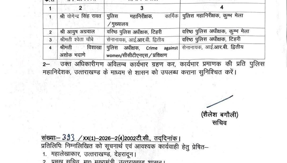 श्वेता चौबे होंगी एसएसपी टेहरी, रावत को कुम्भ मेला की जिम्मेदारी